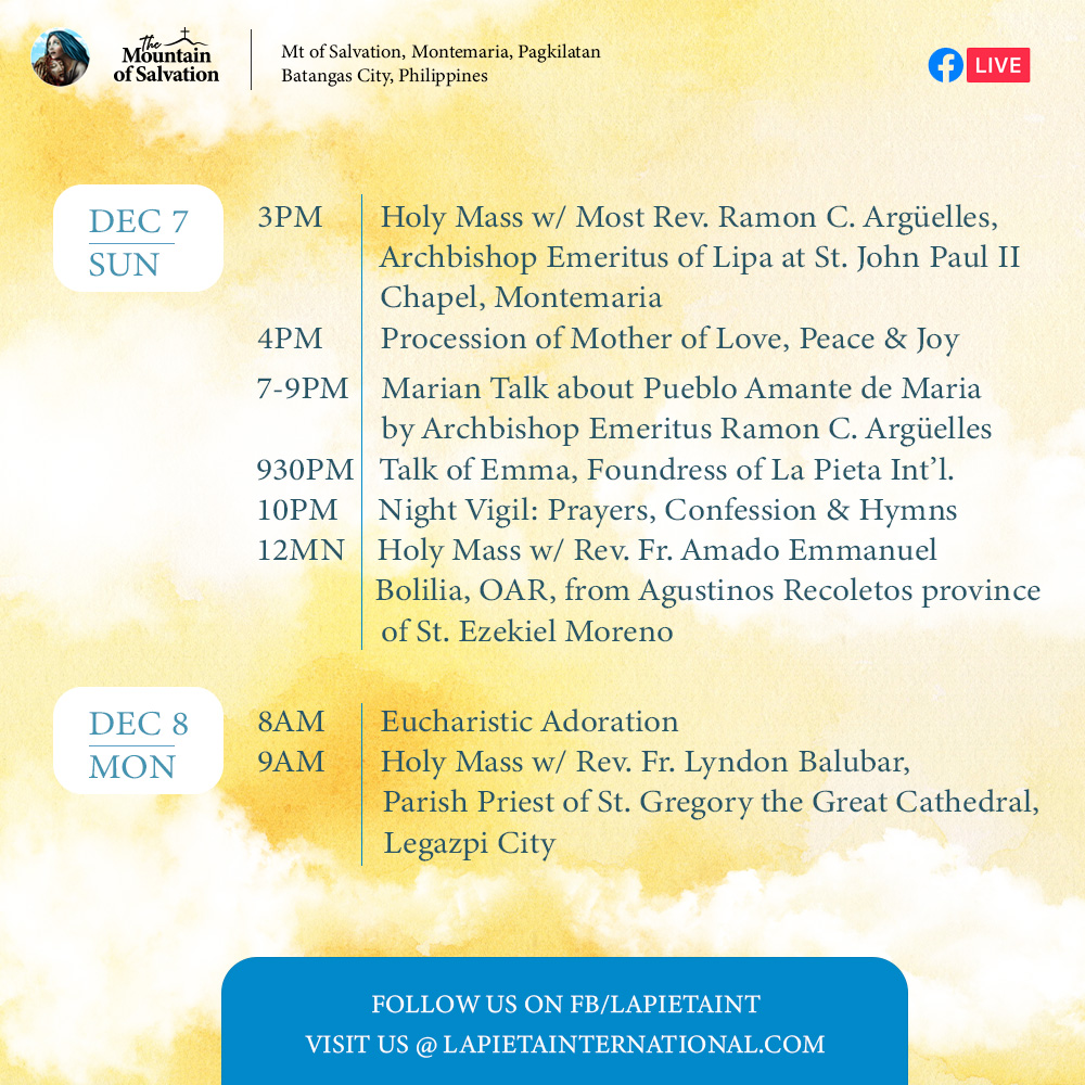 This short video is Emma’s mission in the Philippines. The Mt. of Salvation is a beautiful prayer garden with hermitages, prayer house dedicated to Mother of Love, Peace and Joy who appeared at the grotto in the Holy Mountain which is located at Montemaria, Pagkilatan, Batangas City in the Philippines. It also showcase the construction and on-going development. We invite everyone to join our 8th of the Month Holy Mass, adoration and prayer so as to walk with us in this journey of faith, a journey to walk to the Mountain of Salvation (which is Jesus) together with our Mother of Love, Peace and Joy, the Holy Saints and Angels through the messages given to Emma together with the La Pieta International Prayer Group.